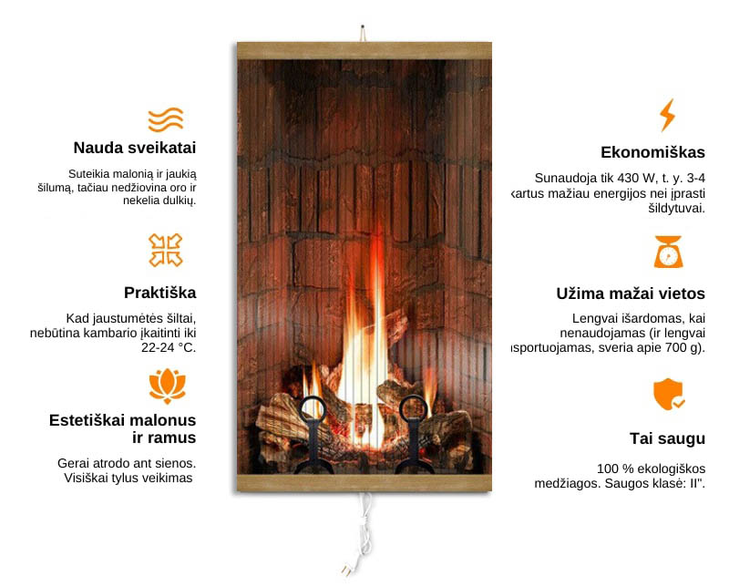 Jis ne tik efektyviai ir kompaktiškai užtikrina malonią šilumą bet kuriame kambaryje, bet ir suteikia jam naujo blizgesio ir spalvų dėl savo atspausdinto berėmio paviršiaus, kuris traukia akį bet kuriame kambaryje. Šildymo plokštė yra labai plokščia – kaip paveikslas, todėl ją galima kabinti tiesiai ant sienos, iš kur ji skleidžia malonią šilumą.